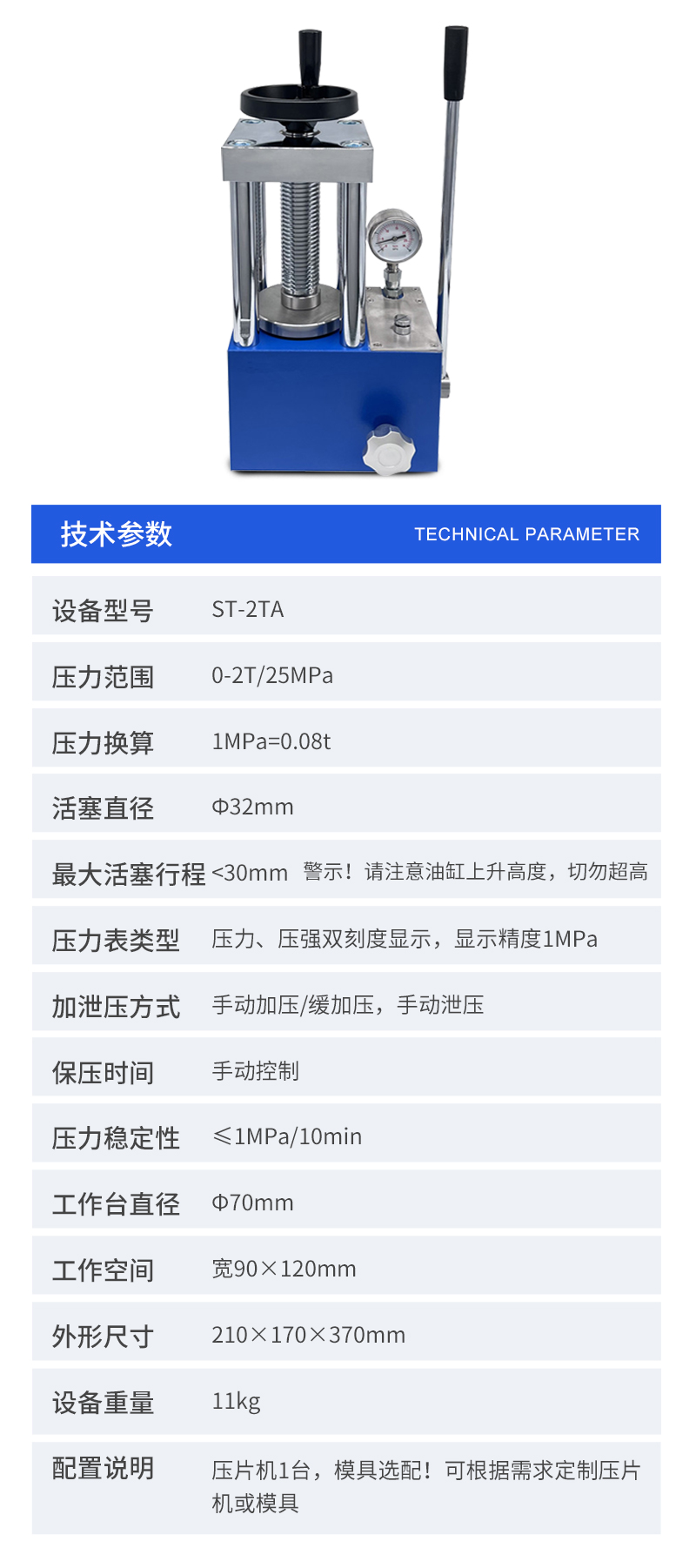| 配置說(shuō)明 | 壓片機(jī)1臺(tái),模具選配,數(shù)顯表選配!可根據(jù)需求定制壓片機(jī)或模具 |