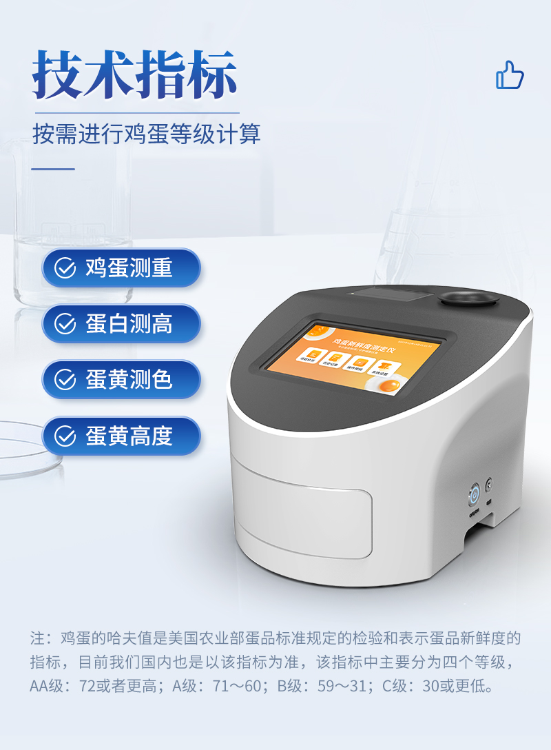 雞蛋品質(zhì)分析儀技術(shù)指標(biāo):雞蛋測重,蛋白測高,蛋黃測色,哈夫值顯示,蛋黃高度等,可進(jìn)行雞蛋等級計(jì)算。雞蛋的哈夫值是美國農(nóng)業(yè)部蛋品標(biāo)準(zhǔn)規(guī)定的檢驗(yàn)和表示蛋品新鮮度的指標(biāo),目前我們國內(nèi)也是以該指標(biāo)為準(zhǔn),該指標(biāo)中主要分為四個等級,AA級:72或者更高;A級:71~60;B級:59~31;C級:30或更低。
