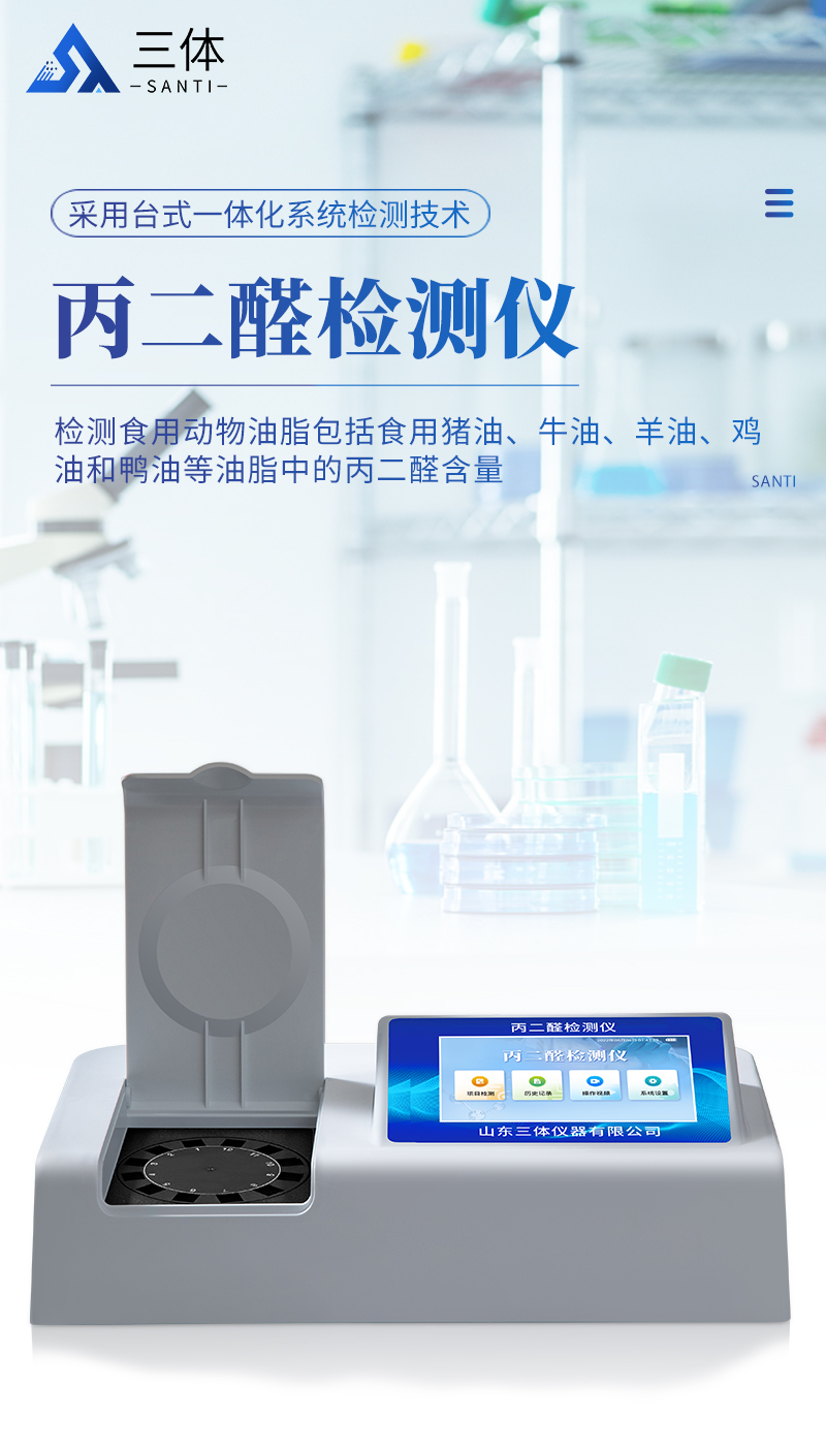 山東三體儀器有限公司生產(chǎn)的丙二醛檢測(cè)儀為集成化食品安全快速檢測(cè)分析設(shè)備,采用臺(tái)式一體化設(shè)計(jì),能夠快速檢測(cè)食用動(dòng)物油脂包括食用豬油、牛油、羊油、雞油和鴨油等油脂中的丙二醛含量;儀器預(yù)留其他項(xiàng)目檢測(cè)程序和端口,根據(jù)日后需求可進(jìn)行遠(yuǎn)程升級(jí)