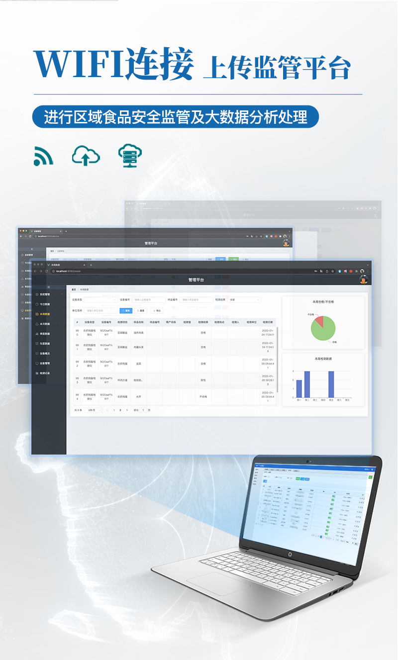 9.6、數(shù)據(jù)監(jiān)管系統(tǒng):同步對(duì)接監(jiān)管平臺(tái),數(shù)據(jù)可局域網(wǎng)和互聯(lián)網(wǎng)數(shù)據(jù)上傳,檢測結(jié)果可選擇直接傳至食品安全監(jiān)管平臺(tái)。進(jìn)行區(qū)域食品安全監(jiān)管及大數(shù)據(jù)分析處理與數(shù)據(jù)統(tǒng)計(jì),檢測區(qū)域食品安全長短期動(dòng)態(tài),達(dá)到食品安全問題預(yù)估、預(yù)警。