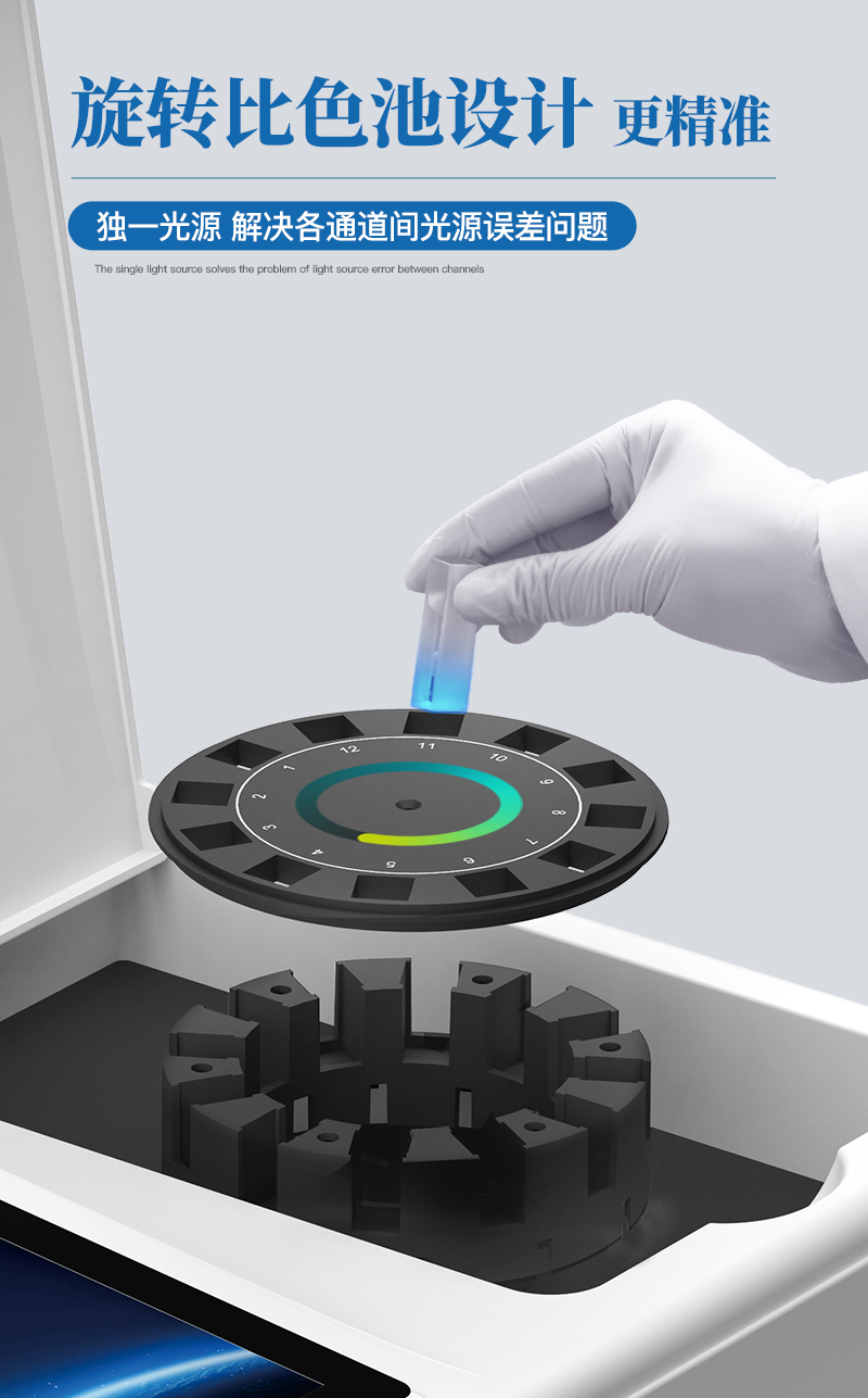 4、檢測通道:≥12通道;采用精密旋轉(zhuǎn)比色池設(shè)計(jì),使用同芯片同光源校準(zhǔn)精度,解決不同光源之間的誤差值,更加準(zhǔn)確高效。